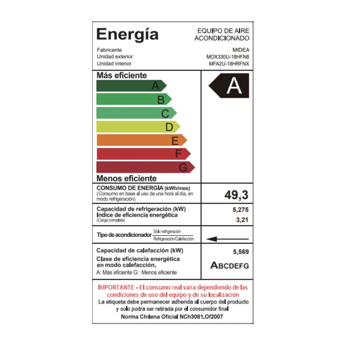 Consola Midea 18,000 Btu/Hr Calefacción Eficiente. Incluye unidad evaporadora, unidad condensadora, control remoto, kit cañería 5m, cable interconexión 5,5m. Superficie climatización: 42m2.